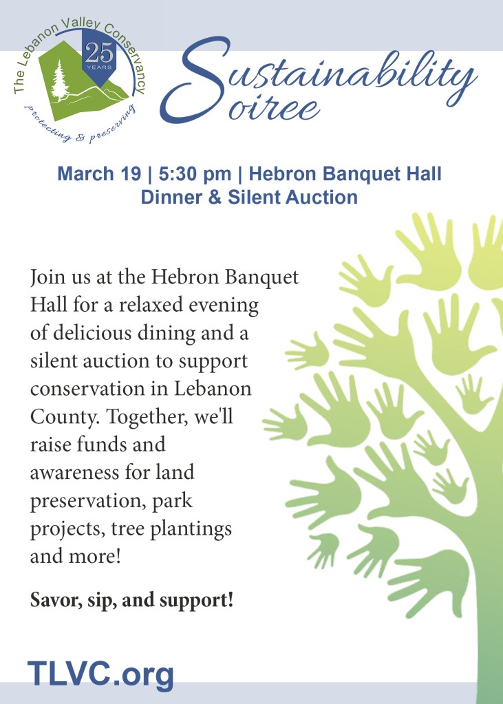 Join us at the Hebron Banquet Hall for a relaxed evening of delicious dining and a silent auction to support conservation in Lebanon County. Together, we’ll raise funds and awareness for land preservation, park projects, tree plantings and more! More info/Registration